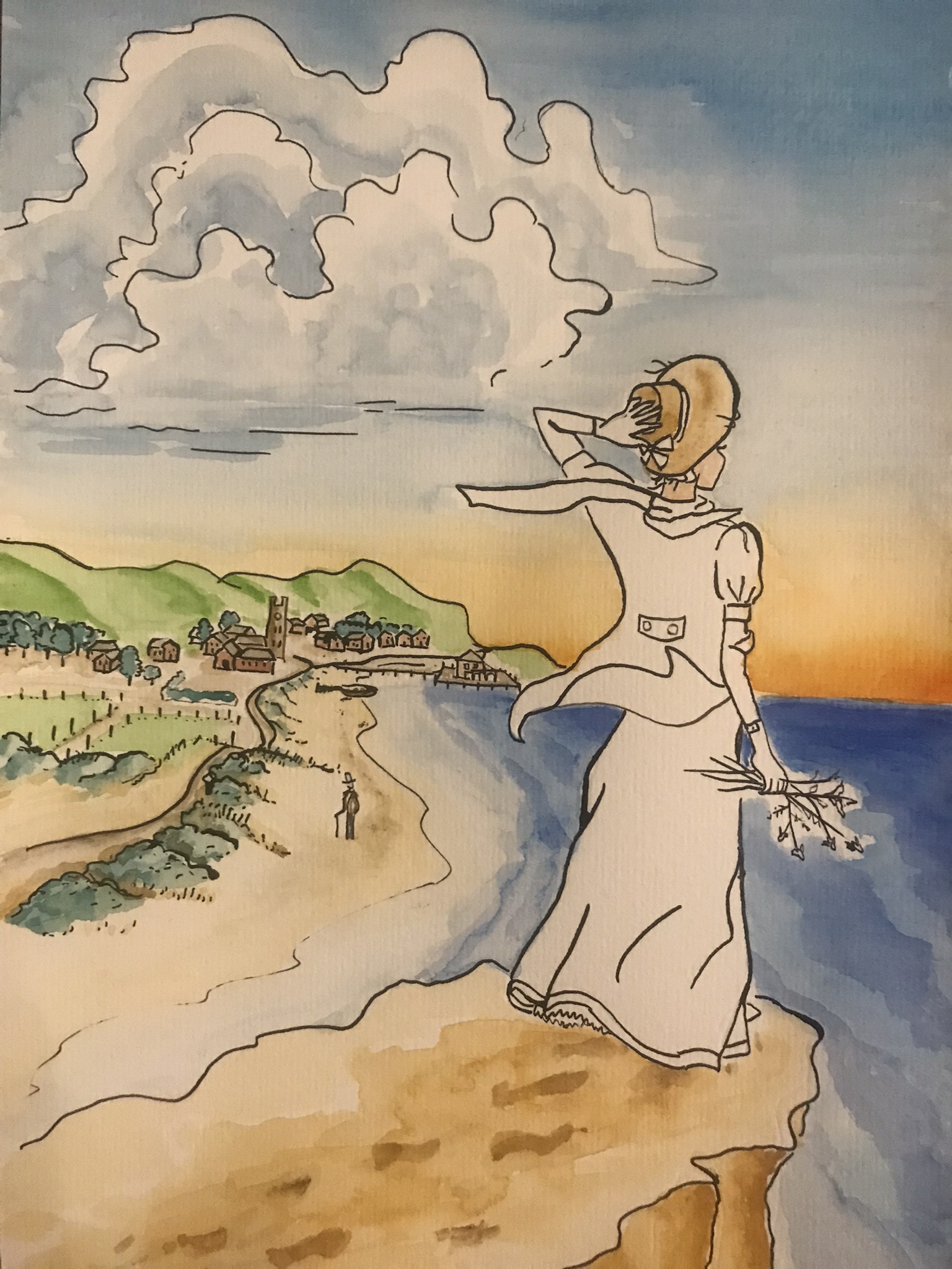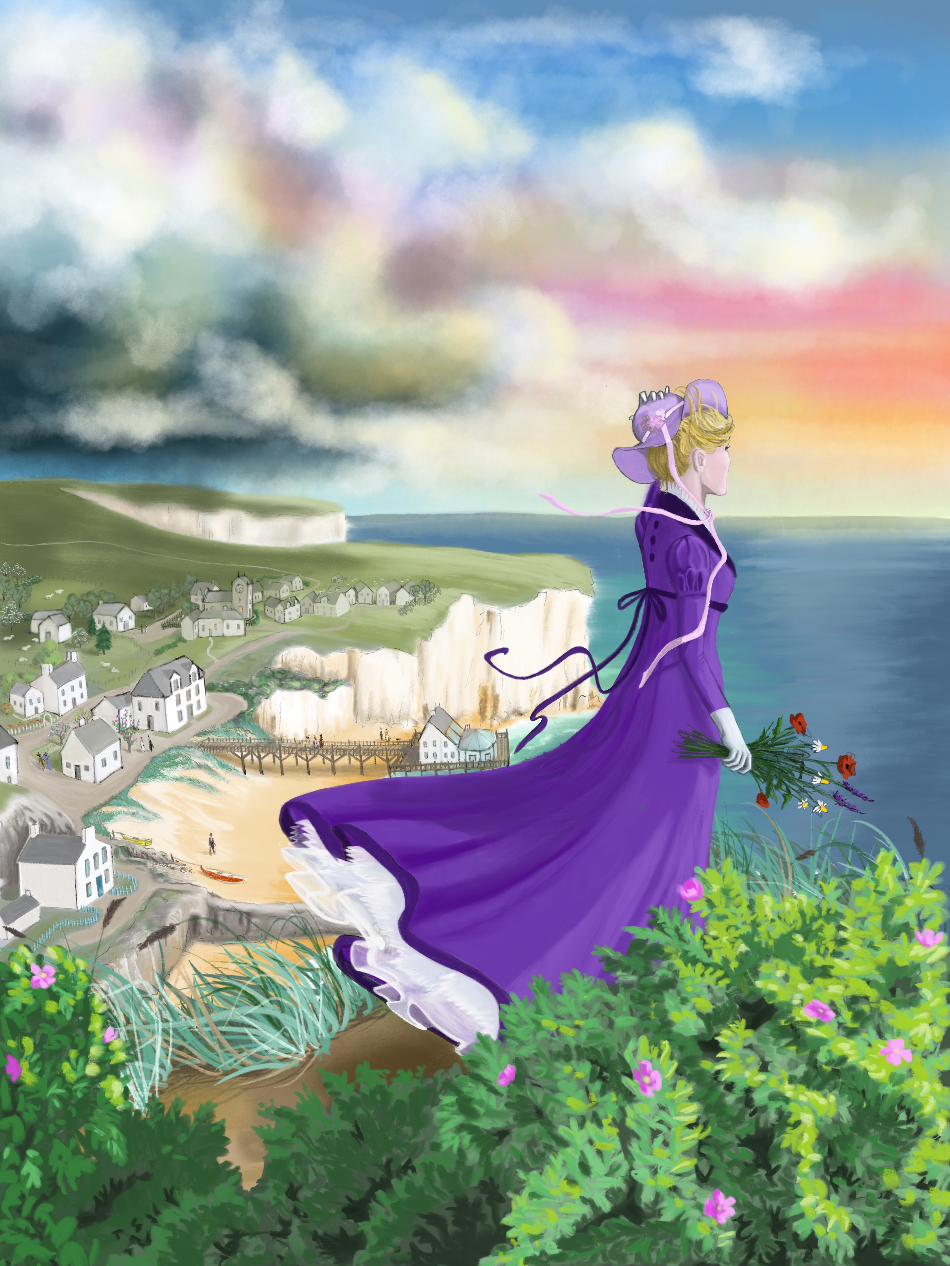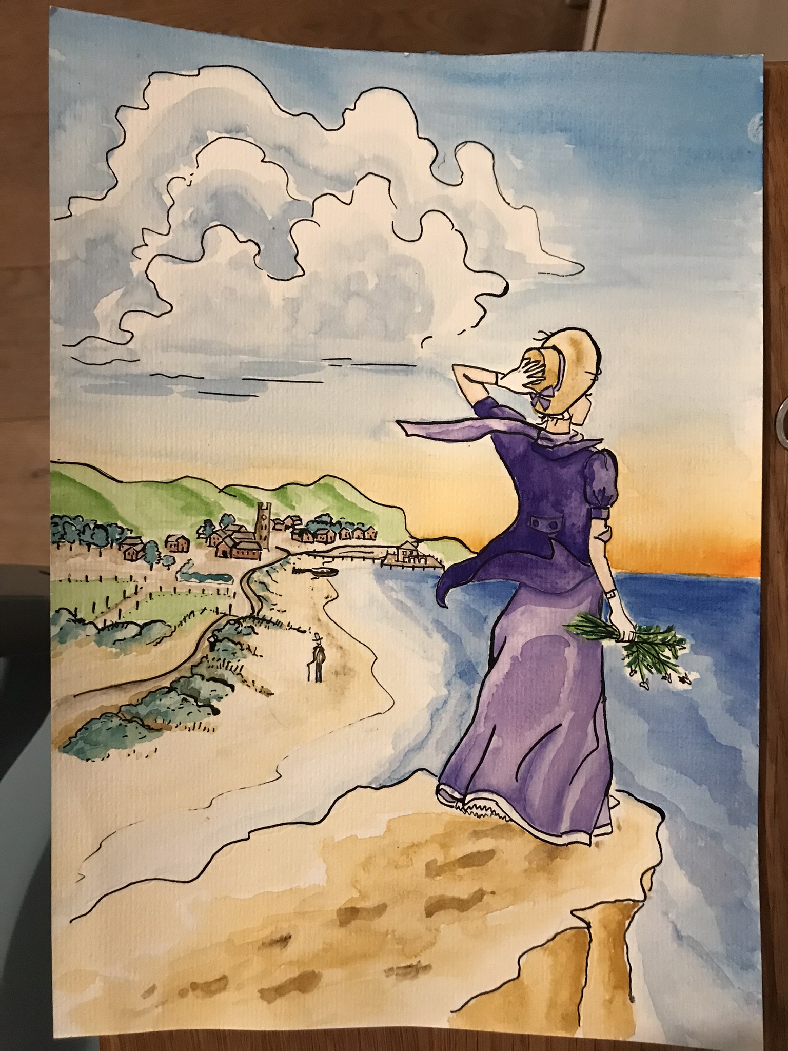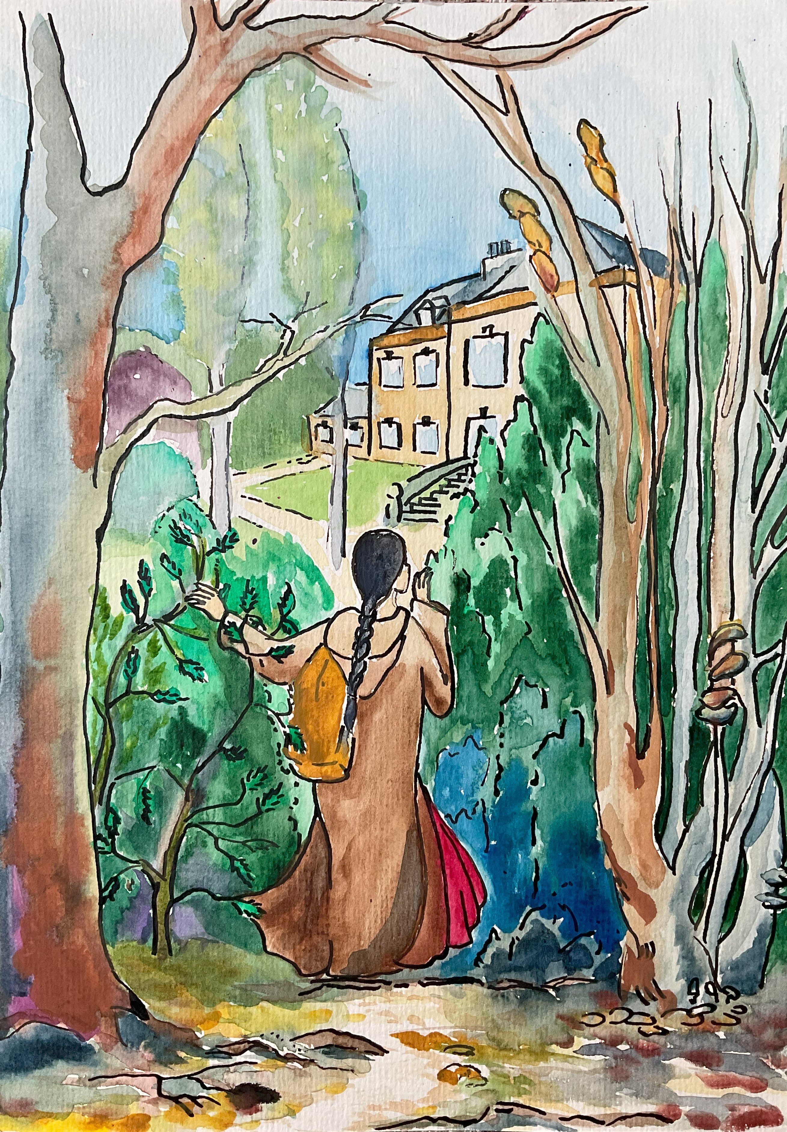 Drawing with ink and painting with watercolour is always bound to accidental colour blending or blots. If the result wasn’t to my liking, there was no chance of erasing or correcting it – so I had to start all over again. I hesitated to use a digital tool because working with the real colours feels right and authentic, unfortunately it is not efficient enough for the purpose I need it for. So, I started with using my pencil draft as a sublayer for my digital painting. The cover of volume 1 is the first digital picture I have created, and I must admit, that it took a while to really familiarise myself with the tools, but I would not want to miss them now. It is a lot of fun working with multiple layers, trying different colours of dresses, background etc. and combining what works out best. Nothing is lost and can be adapted to changing requirements. Additionally: the digital version of the picture is easier to use for cover design.